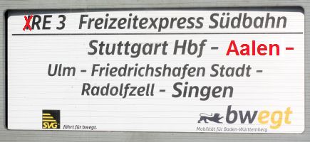 - Friedrichshafen Stadt 17:33/41 - Ulm Hbf 18:51/53 - Aalen Hbf 20:11/31 (Zugnummernwechsel) - Stuttgart Hbf 21:28 |