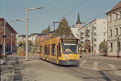 Vom Rathaus kommend fährt der GT4 soeben in die Bahnhofstraße ein.