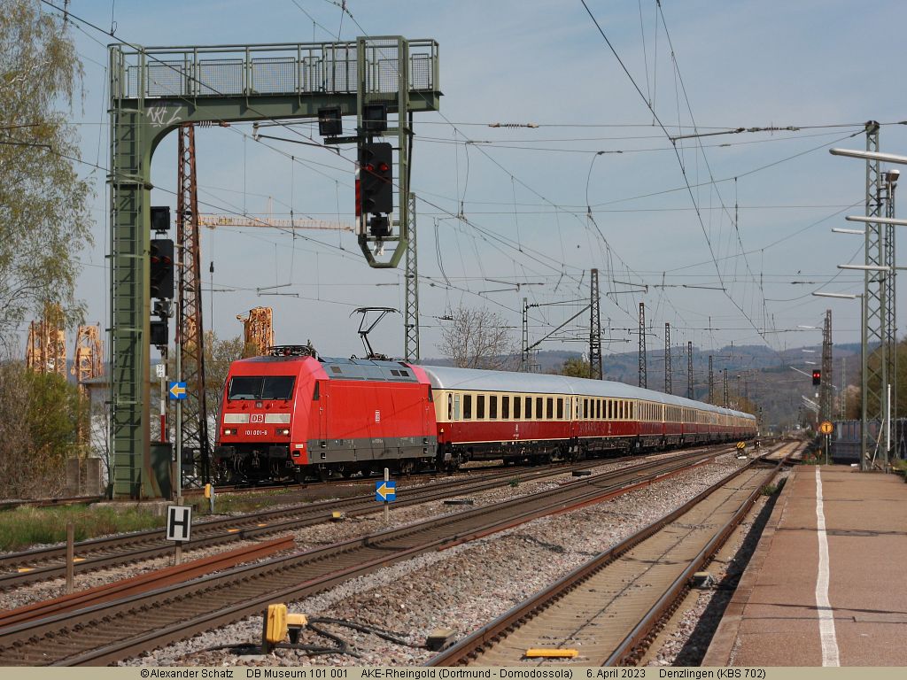 Eine verkehrsrote Museumslok vor dem AKE-Rheingold