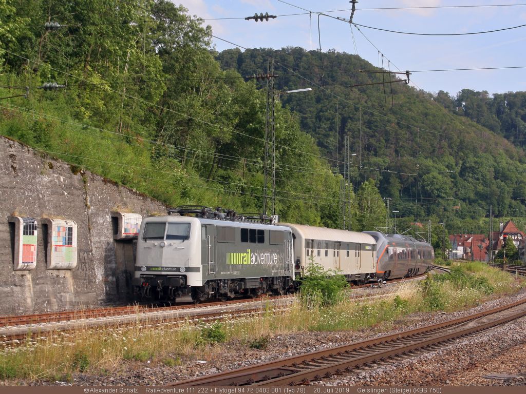 Railadventure-111 222 steht mit einem norwegische Flytoget <