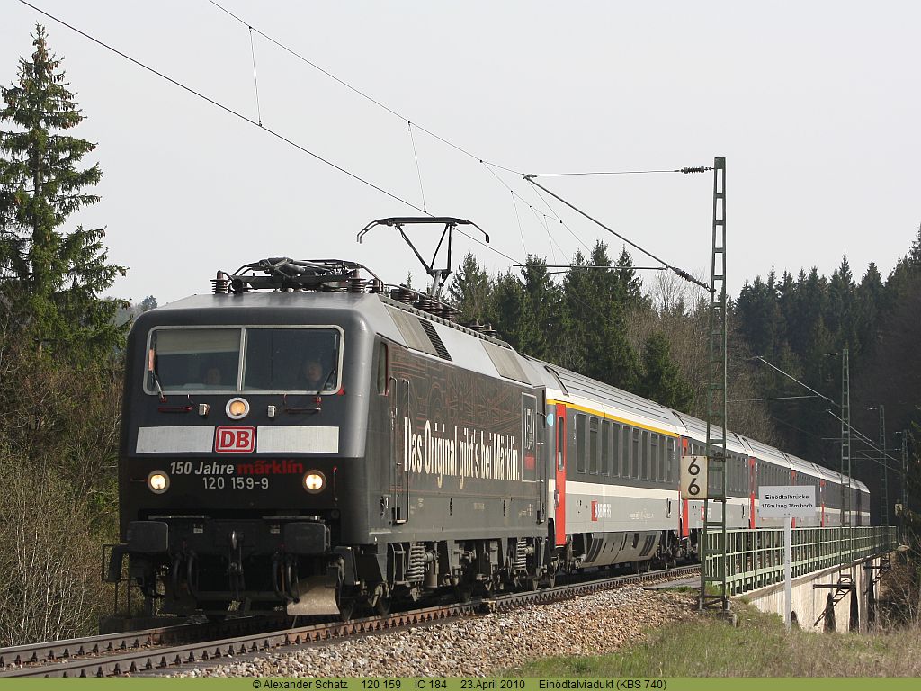Farblich passend präsentiert sich die Märklin-120 mit den schweizerischen EC-Waggons. (23.April 2010)