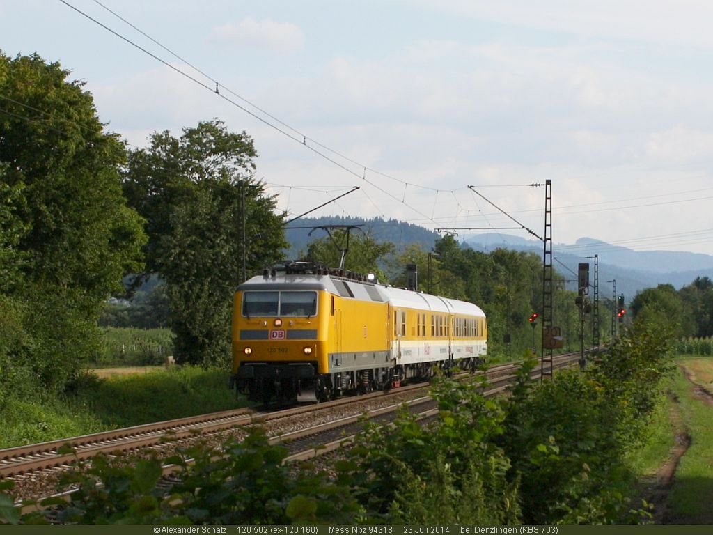 Die letztgebaute 120er ist hier in gelber Messzuglackierung auf der Oberrheinstrecke unterwegs