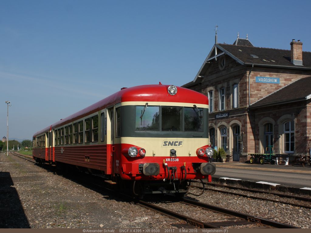 Zwei Klassiker auf einem Bild: Eine Caravelle und das Bahnhofsgebäude von Volgelsheim