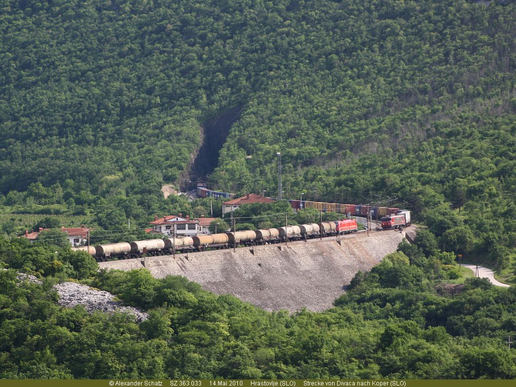 Zugkreuzung in Hrastovlje zwischen 363 033 mit Containerzug und einer 541 mit Tankwagen. (14.Mai 2010)