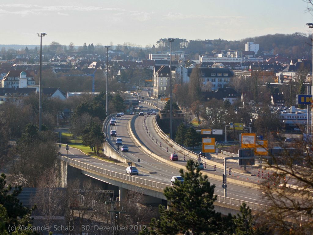 Blaubeurer-Tor-Brücke mit Dehungsfuge (beim roten Pkw) zur Wallstraßenbrücke (rechts)
