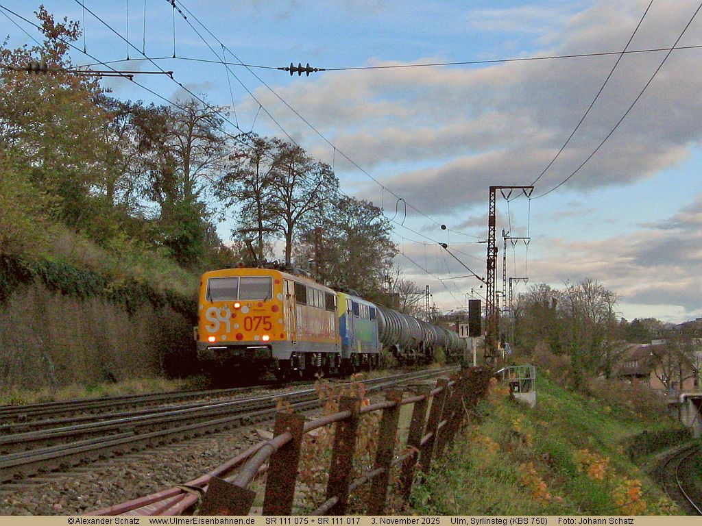Bunte 111er-Doppeltraktion auf dem Weg durch Ulm hindurch
