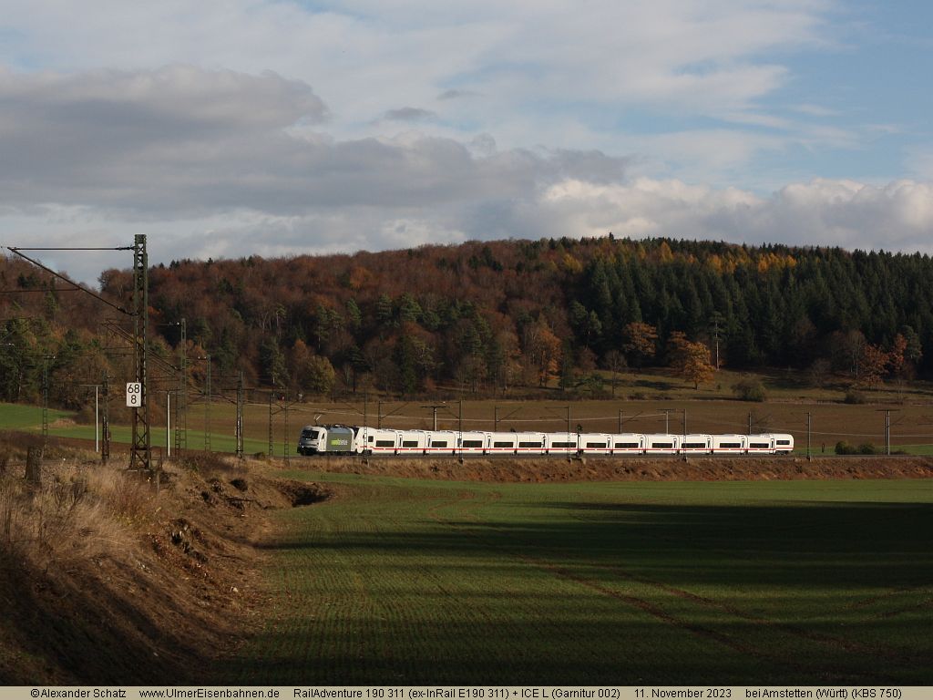 Ein Talgo-ICE L ist mit Messfahrten auf der Geislinger Steige beschäftigt, hier noch auf der Alb zwischen Urspring und Amstetten ...